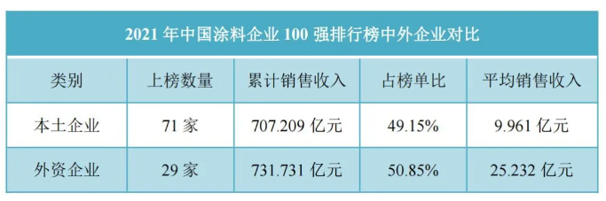 对比来看,外资企业依然表现强势,但本土企业销售收入规模在大幅提升,说明本土企业与外资企业的差距在加速缩小。“受新冠肺炎疫情的影响,阿克苏诺贝尔、PPG、艾仕得、中涂化工等多家外资企业去年在华销售收入下滑;但多家本土企业仍实现了逆势增长,特别是三棵树、东方雨虹、亚士、浩力森、麦加、固克等企业的销售收入增幅远超行业增速,使得本土企业的收入规模继续扩大,同时也提高了整个榜单的收入规模。”榜单编制负责人黄长军表示。