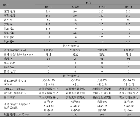 表 2 不同钛白粉对聚酯环氧粉末涂料的性能影响