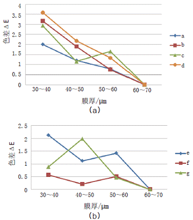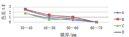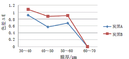 图 2 不同膜厚下,炭黑的色差变化