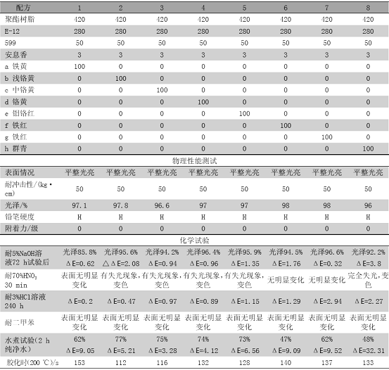 由表 6 可知,当各种颜料在同一配方中使用,且使用量一致时,铁黄、铁红、铬黄(浅铬黄、中铬黄、铬黄)、群青对粉末涂料的机械性能没有大的影响,其冲击性能都可以达到 50 kg · cm 的标准,光泽度只有微小的差异,各种颜料对涂膜的硬度基本没有影响,干附着力以及水煮 2 h 后的湿附着力都可以达到 0 级。但涂膜胶化时间差异很大,这与各种颜料本身的结构以及吸油量有关,这导致了涂膜流平的不同。这几种颜料耐酸、耐碱以及水煮性能差别较大。相对来说,铁红与铁黄耐碱性较其他几种颜料好些,铬系与群青颜料耐硝酸能较差, 70%HNO 3 腐蚀 30 min 后有失光现象。