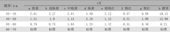 表 7 不同无机彩色颜料喷涂不同厚度时色差变化